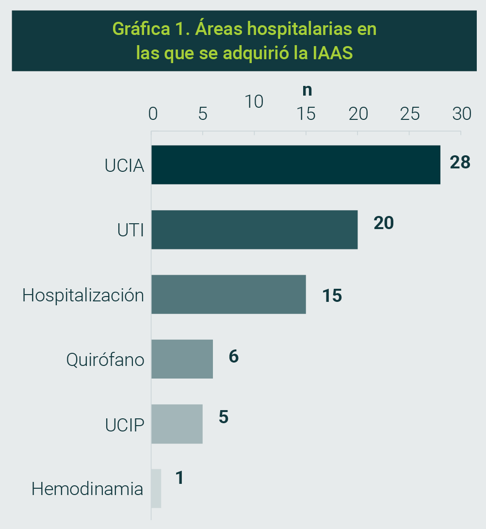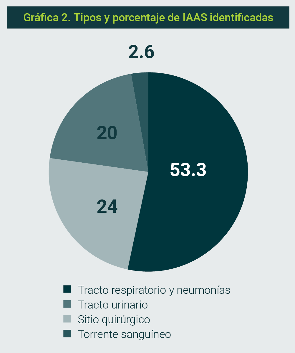 Se detectaron IAAS en 74 pacientes (17%), que adquirieron la infección durante su estancia hospitalaria; y fueron más frecuentes en la Unidad de Cuidados Intensivos de Adultos (UCIA) (28, 32%). Las principales localizaciones de IAAS fueron el tracto urinario, el respiratorio inferior y el torrente sanguíneo (Gráficas 1 y 2).