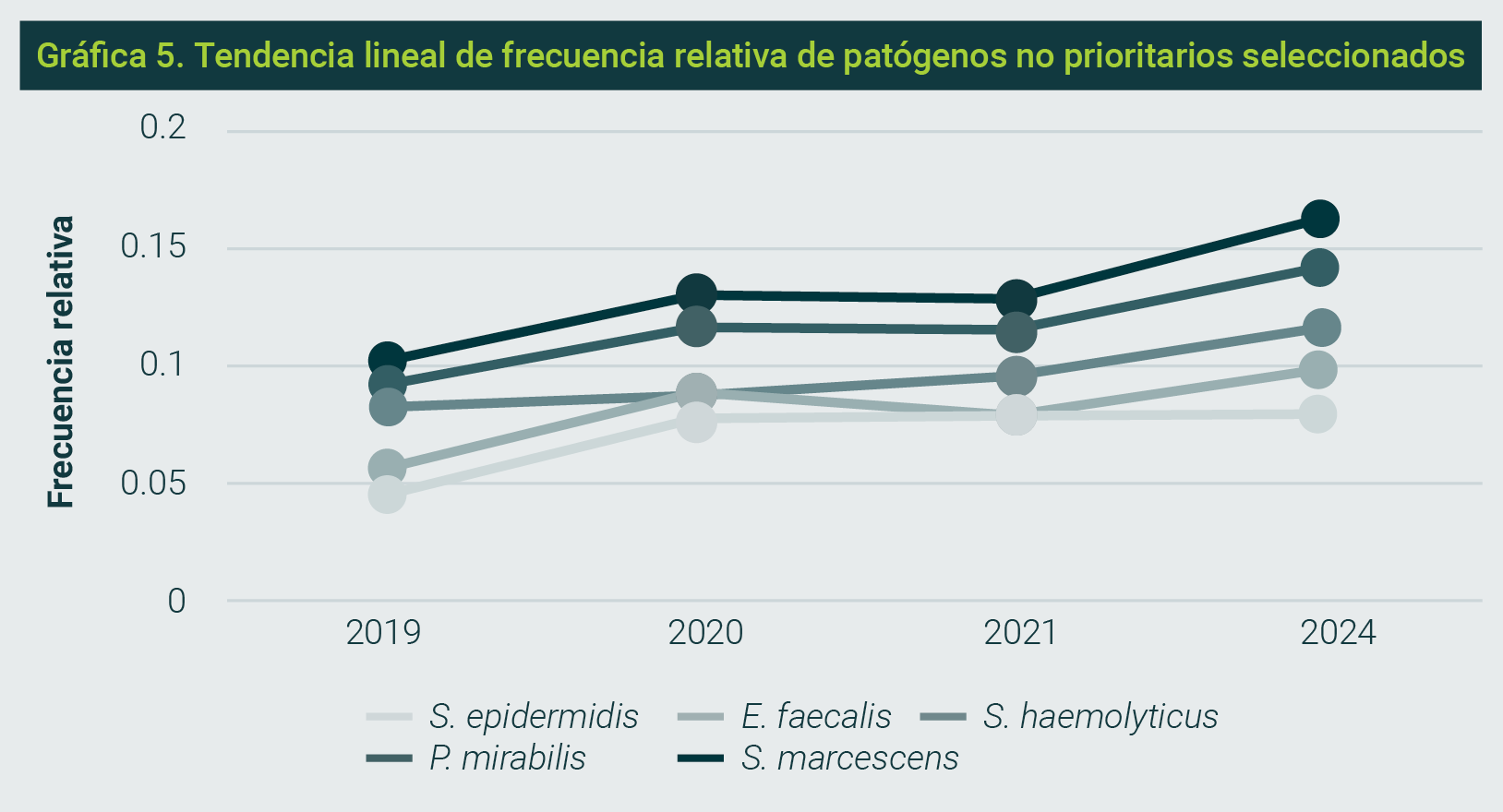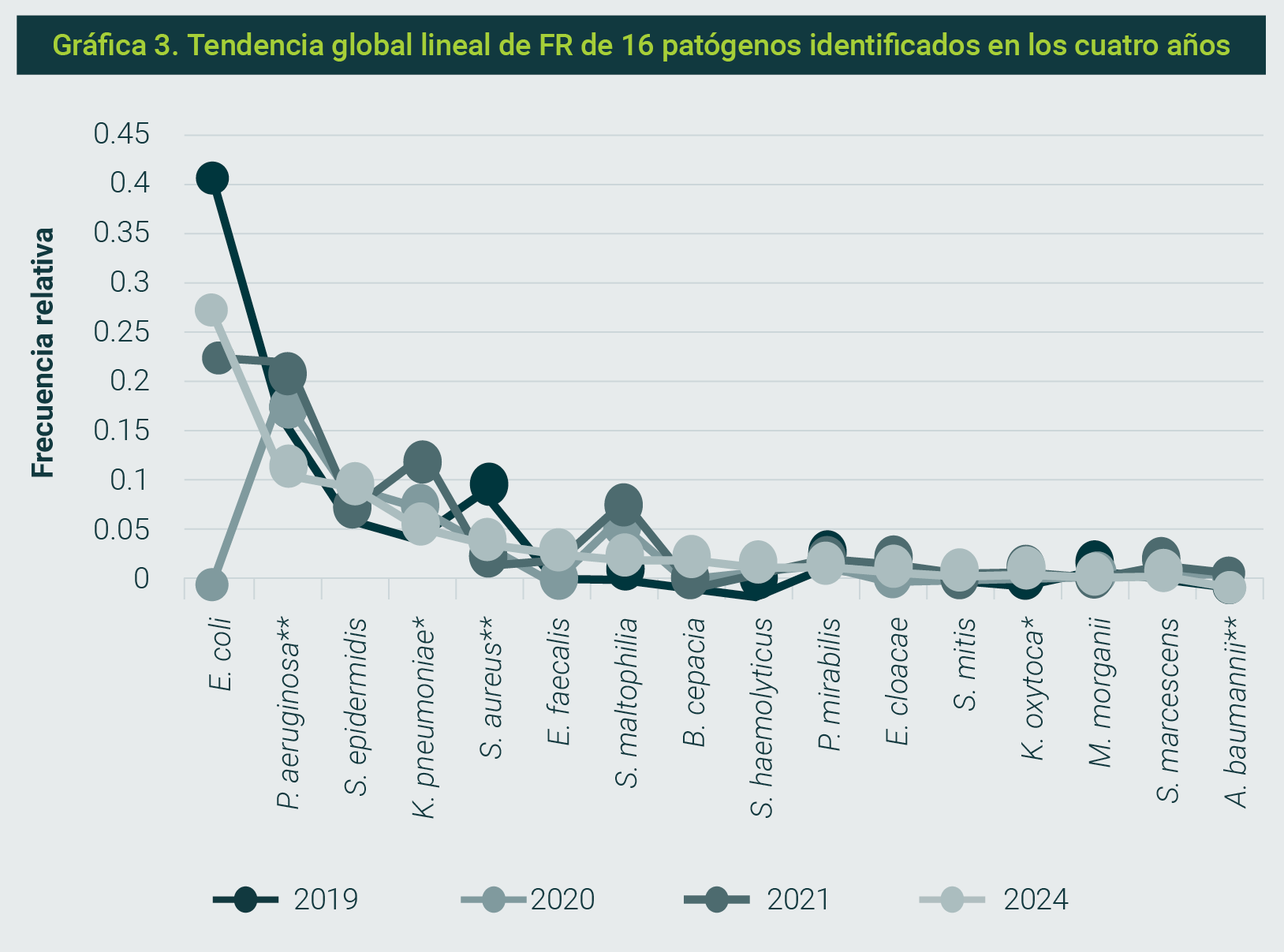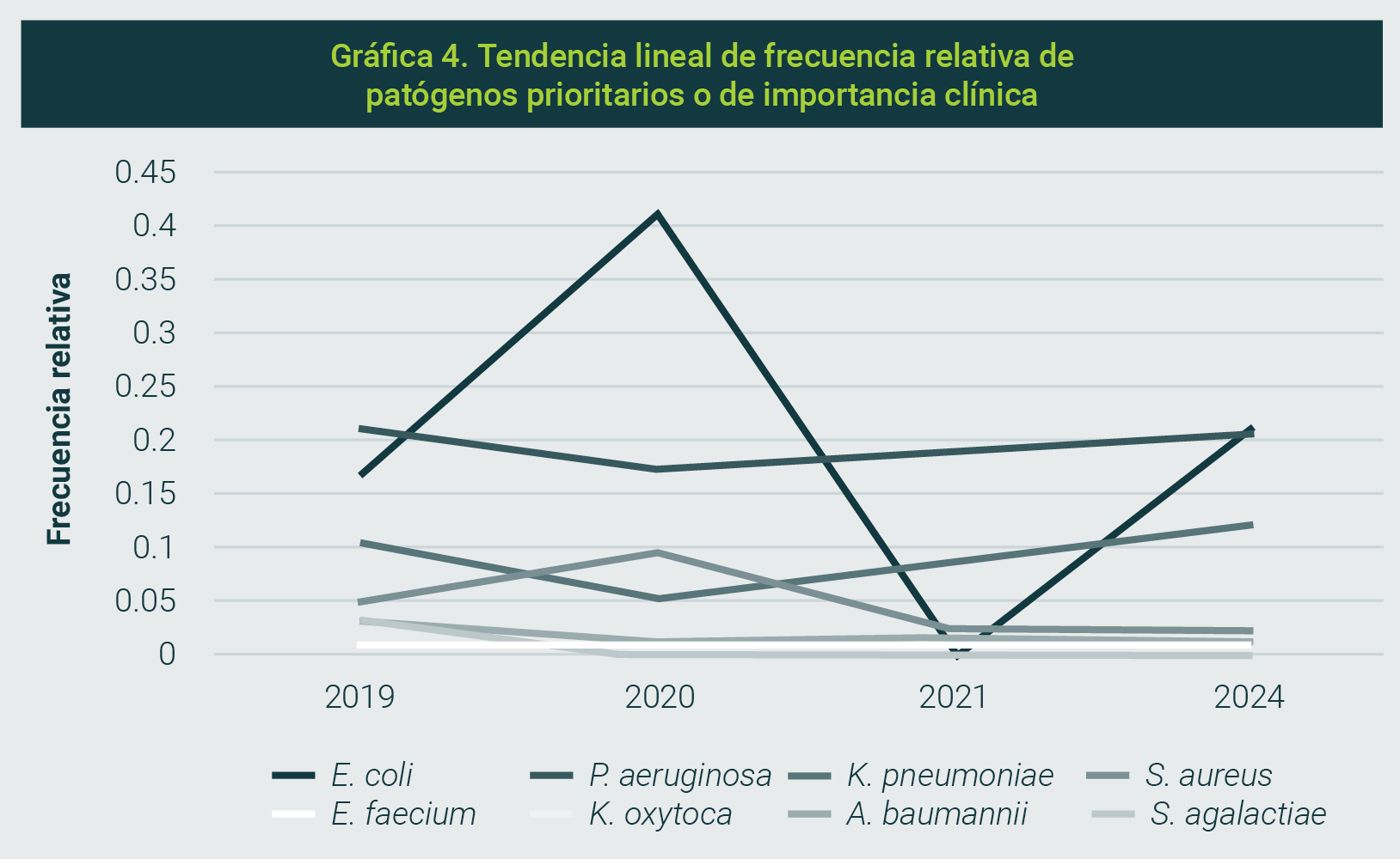 Para el análisis comparativo de FR se realizaron pruebas de x2 para bacterias prioritarias o de importancia clínica y para bacterias no prioritarias con los datos del mismo hospital de cuatro años: 2019, 2020, 20216 y 2024. En ningún caso hubo diferencias significativas. En las Gráficas 3, 4 y 5 se muestra el análisis global de tendencias lineales de FR de 16 bacterias identificadas en los cuatro años, así como la tendencia de patógenos prioritarios y no prioritarios seleccionados.