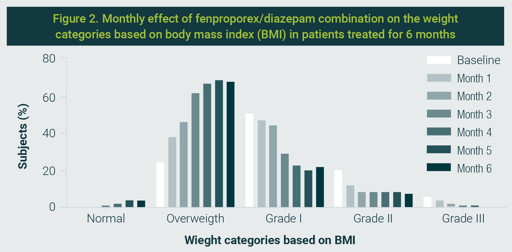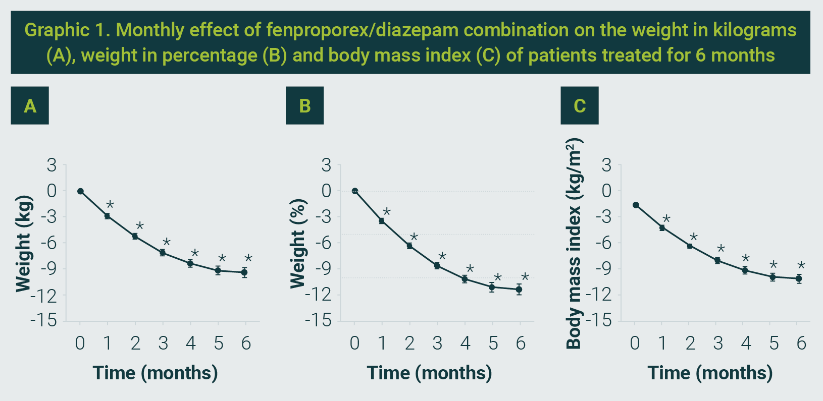 The results show that the combination of fenproporex and diazepam reduced body weight by 11.3 ± 6.8% (SD) after six months of treatment in our per-protocol analysis. Furthermore, 82% and 55% of subjects reached at least 5% and 10% of body weight loss, respectively; and the subjects diminished their BMI from obesity grade 1 (32.8 ± 4.0 kg/m2) to overweight (29.0 ± 3.3 kg/m2) on average; likewise, other anthropometric measures also decreased after a 6-month follow-up period.