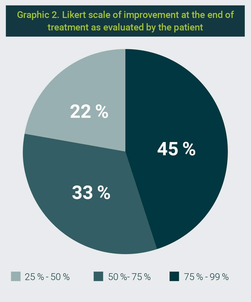 At the end of treatment, all patients rated the outcome as positive, with improvement greater than 25%, and the majority (45%) rated their improvement as greater than 75% (Graphic 2).