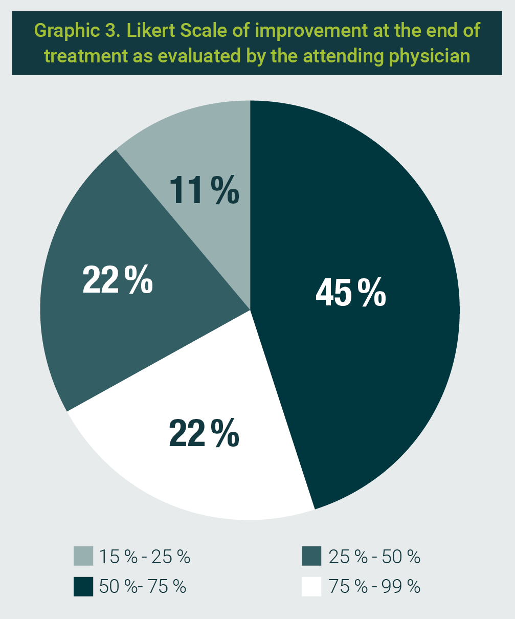 At the end of the treatment, the attending physicians also rated the outcome as positive, with an improvement greater than 15%. In 22% of cases, the result was rated as greater than 75% (Graphic 3).