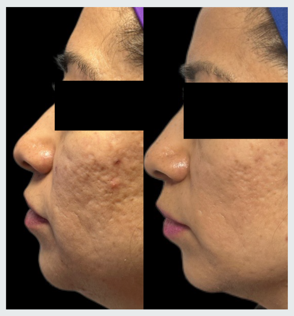 The combination of high- and low-molecular-weight ultrapure hyaluronic acid—known as hybrid cooperative complexes (HCCs)—has shown significant efficacy in activating fibroblasts and reducing the appearance of acne scars.7 These complexes create a space that prevents reattachment of fibrotic strands in the dermis and encourages new connective tissue formation above the product application, leading to aesthetic improvement.8,9