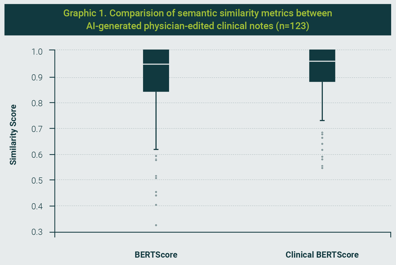 Semantic analysis yielded a high average BERTScore F1 of 0.889 (SD: 0.14), indicating a strong overall alignment between AI-generated and physician-finalized notes. The Clinical BERTScore (CBERTScore), designed to emphasize the retention of medically relevant terms, had a slightly higher mean of 0.917 (SD: 0.11), reflecting a tighter distribution and enhanced semantic precision in domain-specific content (Graphic 1).