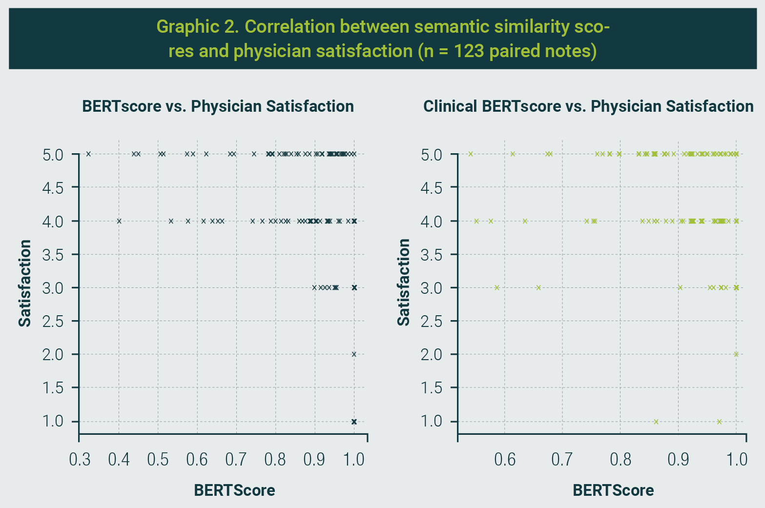 Conversely, the Clinical BERTScore, which emphasizes medical terminology retention, showed no meaningful correlation with satisfaction ratings (Spearman: -0.023, p = 0.799; Pearson: 0.011, p = 0.900). These findings highlight a potential disconnect between surface-level semantic similarity and subjective satisfaction, underscoring the need to consider both technical accuracy and clinical relevance when evaluating AI-generated documentation.
