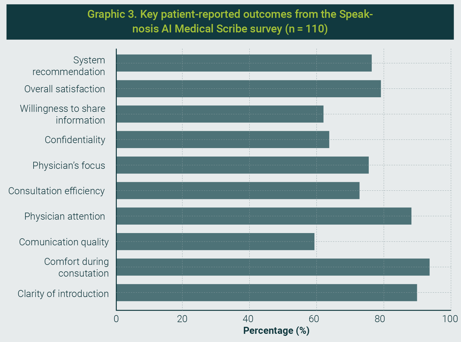 Patient satisfaction with the AI-powered scribe was evaluated using a structured survey that encompassed the key dimensions of the clinical experience.