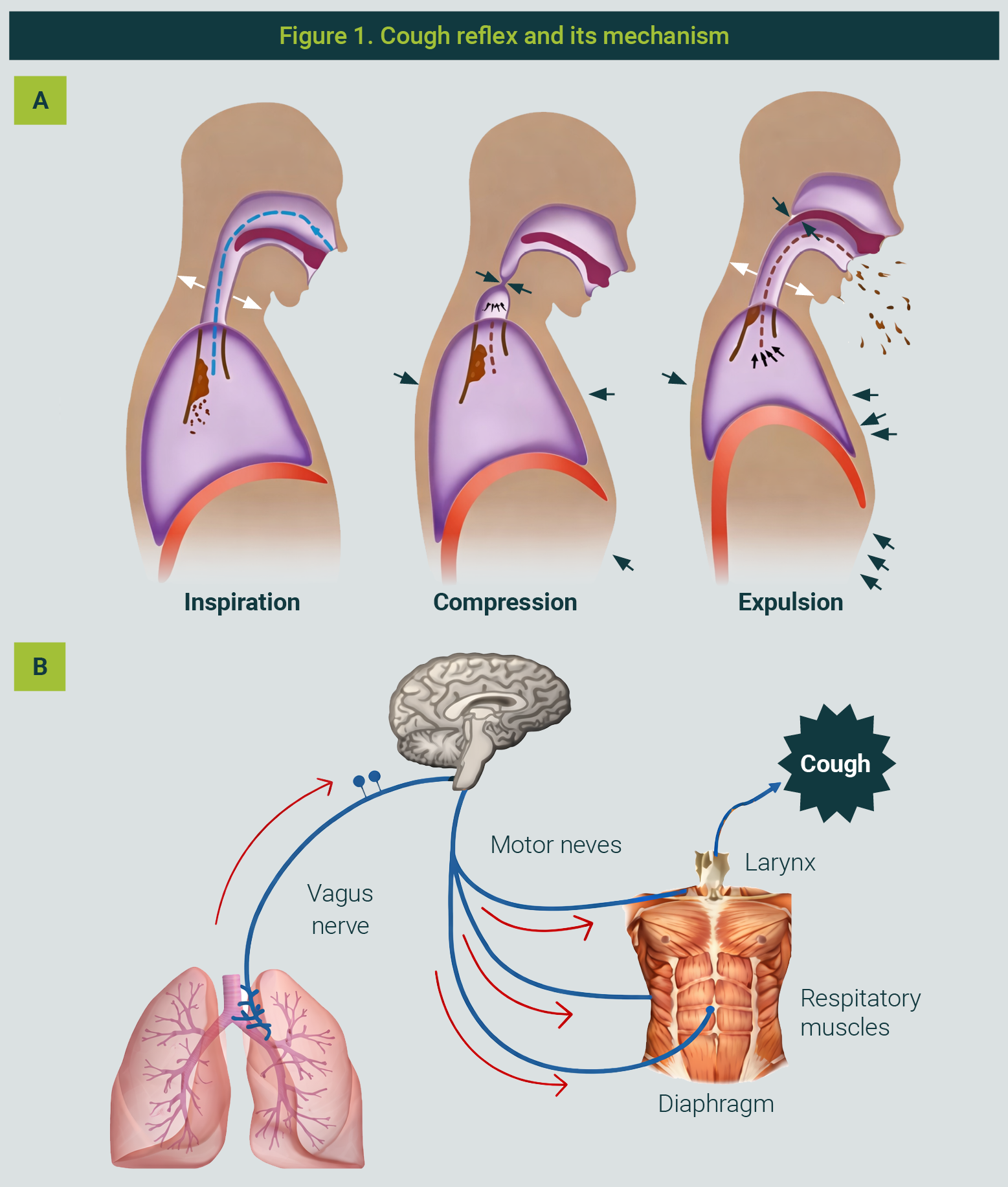 The cough reflex protects the lower airways by preventing the entry of harmful particles (Figure 1). It is triggered when mucosal receptors detect irritants, initiating three phases: deep inspiration, compression with glottic closure, and rapid air expulsion.11-13