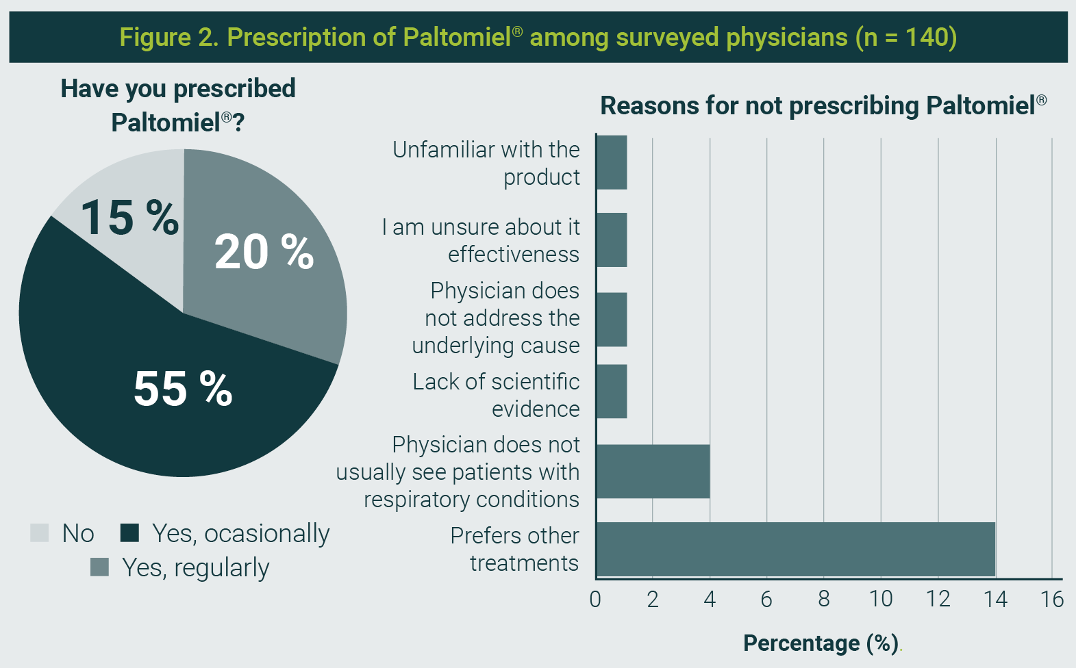 Paltomiel® was known to 96,5% of physicians, and 83,6% had prescribed it—either occasionally (52,9%) or regularly (30,7%). Among non-prescribers, the main reasons cited were a preference for other treatments (63,6%), infrequent management of respiratory cases, or uncertainty regarding the efficacy of these treatments (Figure 2).