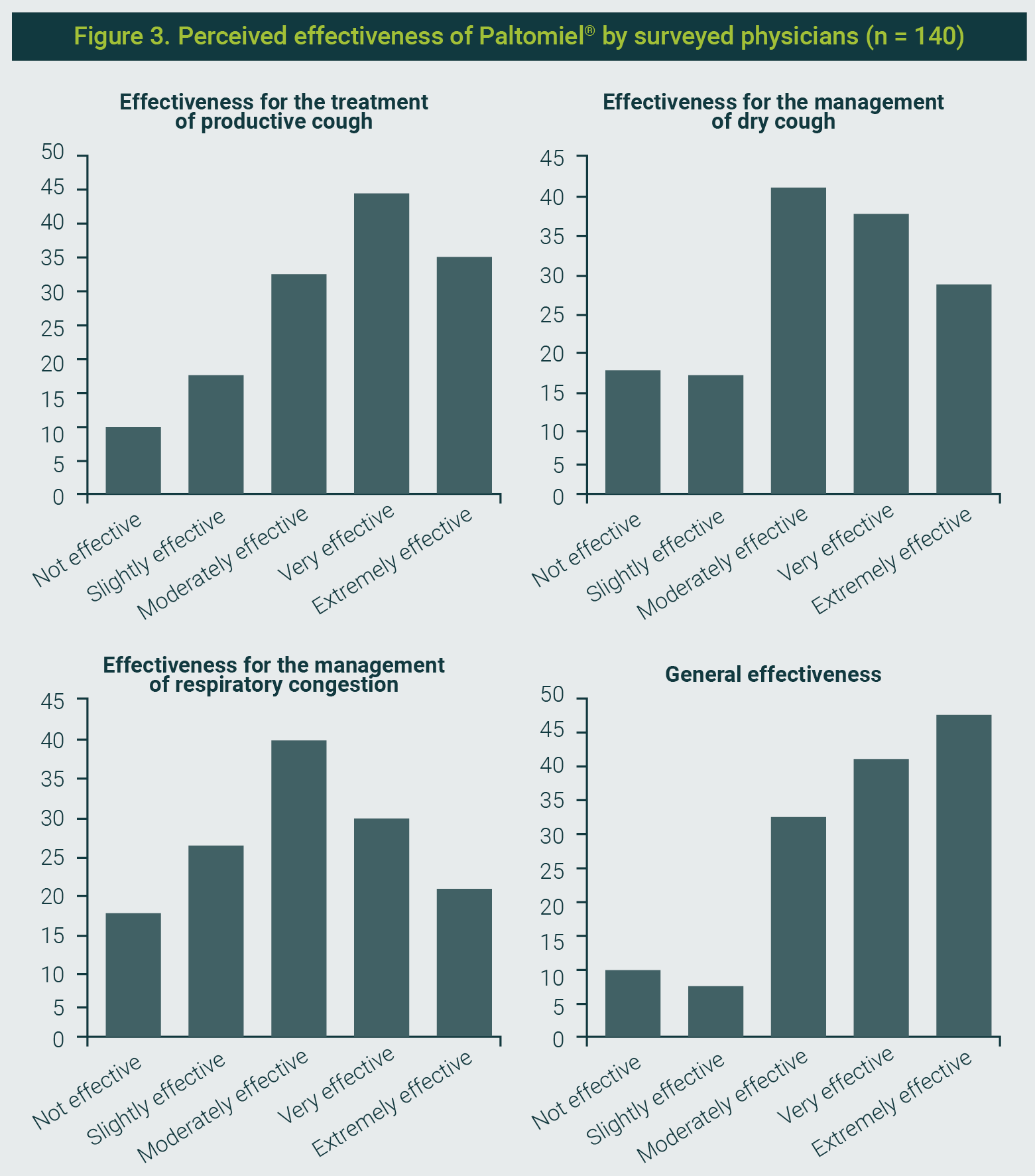Effectiveness was remarkably well rated for productive cough (80%) and to a slightly lesser extent for dry cough (75%).