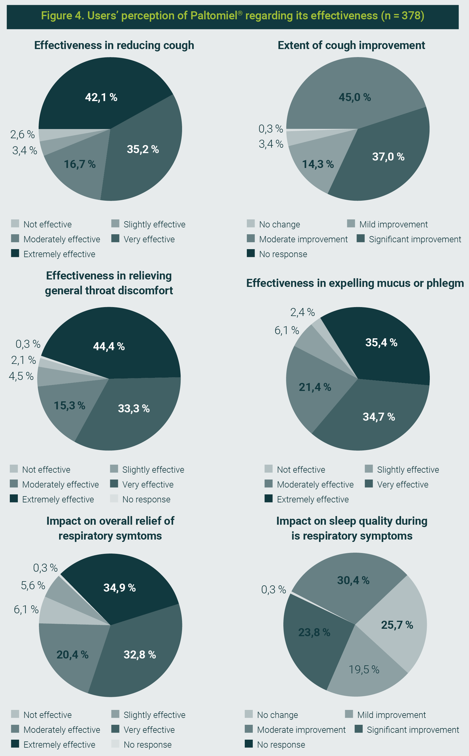 The syrup was considered useful for reducing cough by 93,9% of respondents, with 77,2% rating it as very or extremely effective.