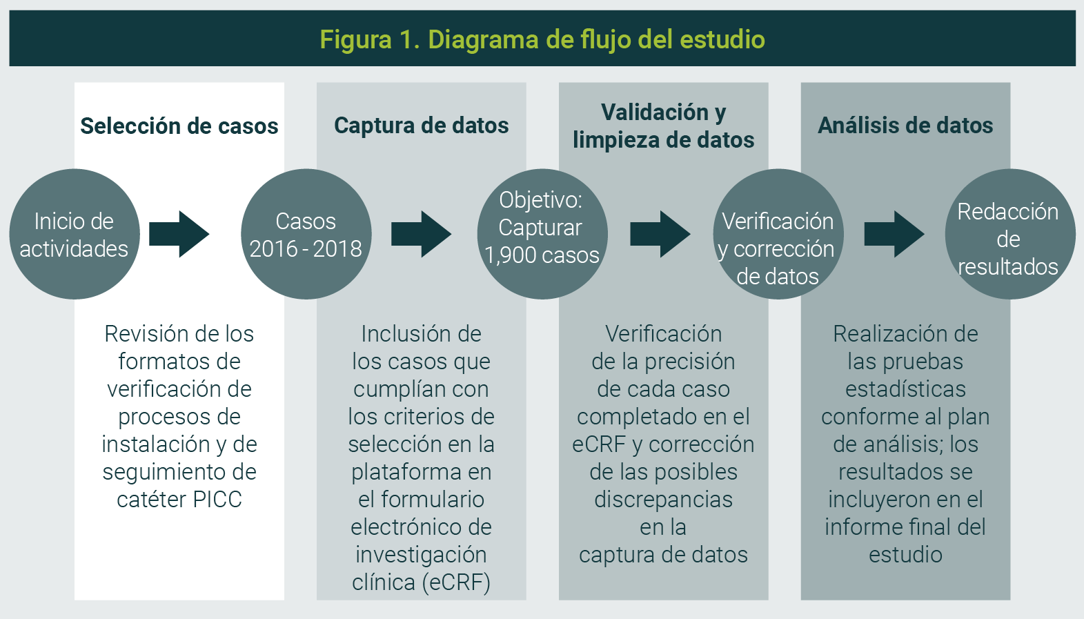 Estudio observacional, transversal y retrospectivo, en el que se revisaron los formatos de verificación de los procesos de instalación y la hoja de actividades de seguimiento de catéter venoso central de los pacientes que recibieron terapia de infusión con catéter central de inserción periférica (PICC Nursing®) de 2016 a 2018 en la Clínica de Catéteres del Hospital Militar de México.