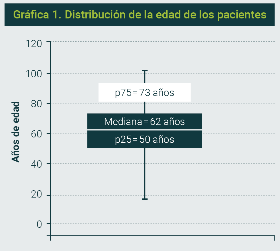 La edad presentó una tendencia central, representada por el valor de la mediana de 62 años, RIC: 50-73 años (Gráfica 1).