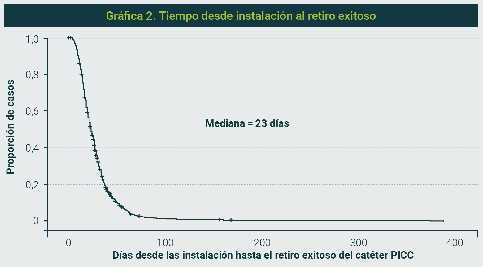 La permanencia del catéter tuvo una mediana de 23 días y alcanzó un máximo de 388 días (Gráfica 2).