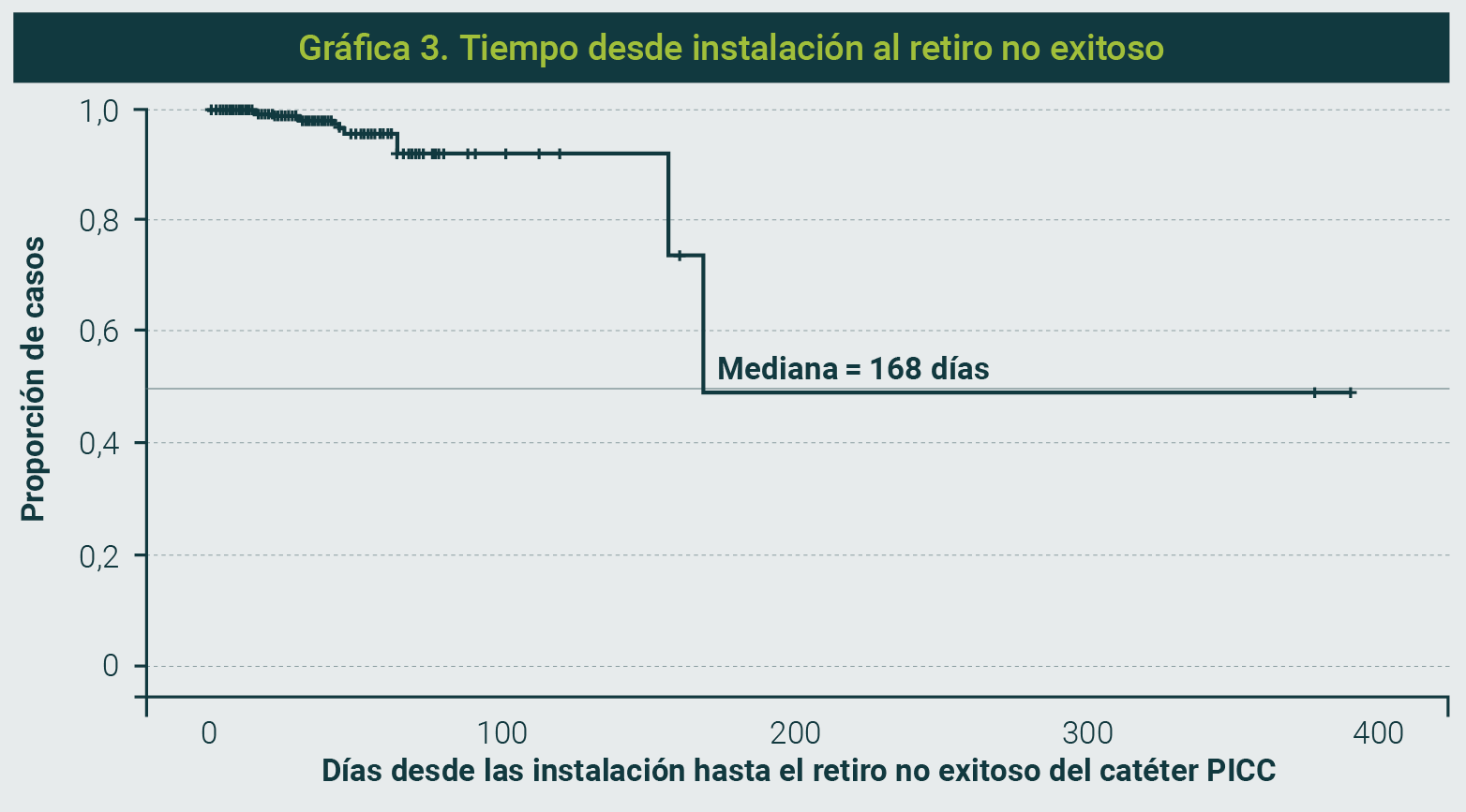 El retiro no exitoso se presentó desde 0 hasta los 168 días después de la colocación del catéter PICC. De manera descriptiva, se observó que los retiros no exitosos tendieron a presentarse con mayor frecuencia a medida que aumentó el tiempo de permanencia del catéter, lo que sugiere mayor probabilidad de complicaciones asociadas con permanencias prolongadas (Gráfica 3).
