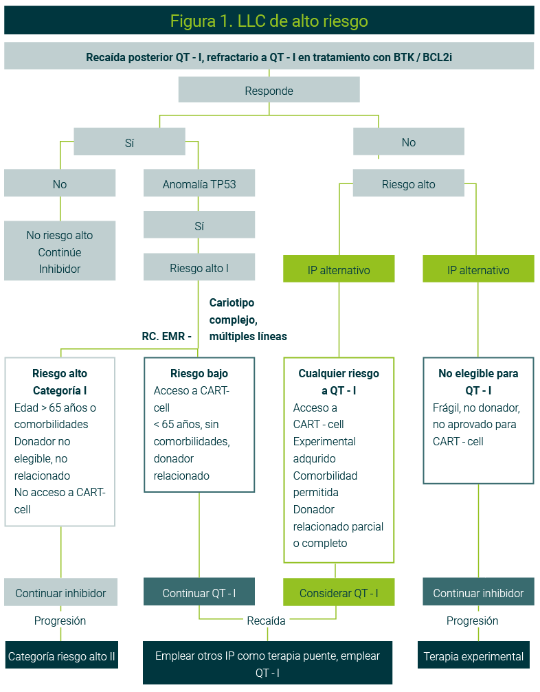 Categoría I (quimio-inmunoterapia resistente, QT-I). Pacientes con anomalía de TP53, con falla a QT-I, pero que responden a inhibidores de tirosincinasa /BCL2i.