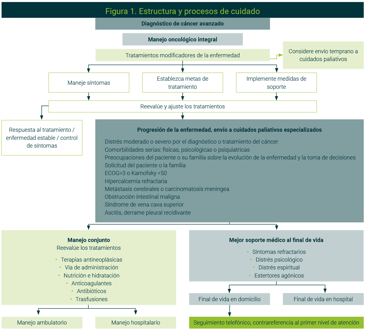 De acuerdo con las recomendaciones de la ASCO, los cuidados paliativos debieran proporcionarse a todos los pacientes con cáncer avanzado o metastásico dentro de las ocho semanas posteriores al diagnóstico, considerando la complejidad del manejo. De manera rutinaria, el oncólogo inicia el manejo paliativo primario en estos pacientes; conforme la complejidad de la atención incrementa, se integra la atención de los equipos de cuidados paliativos.