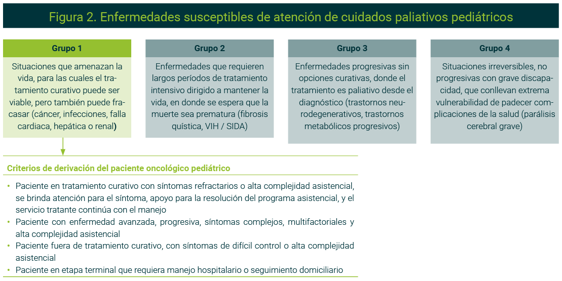 La OMS subraya que estos constituyen «un enfoque que mejora la calidad de vida de los pacientes y familias que afrontan una enfermedad que amenaza la vida de un niño, a través de la prevención y alivio del sufrimiento». Por tanto, no deben limitarse exclusivamente a los últimos días de vida, sino que deben aplicarse progresivamente a medida que avanza la enfermedad y en función de las necesidades de pacientes y familia, particularmente en las enfermedades que no responden a tratamiento curativo, en cuyo caso es ideal la intervención desde el diagnóstico de la enfermedad.