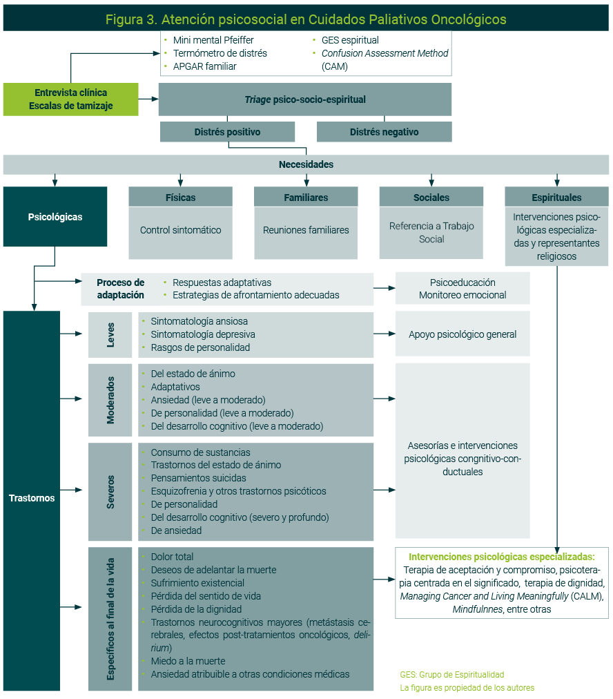 Además referir al área médica para atender las necesidades físicas, se debe brindar atención psicológica como coadyuvante en el control sintomático. Los psicológos formados en cuidados paliativos deben establecer niveles de atención de acuerdo con la psicopatología o alteraciones psicoemocionales especificas en el contexto paliativo. En las necesidades familiares, el abordaje psicológico se realiza en conjunto con Trabajo Social. Para las necesiades espirituales, además de intervenciones específicas, se puede recurrir a un representante religioso y/o espiritual (Figura 3).33-37