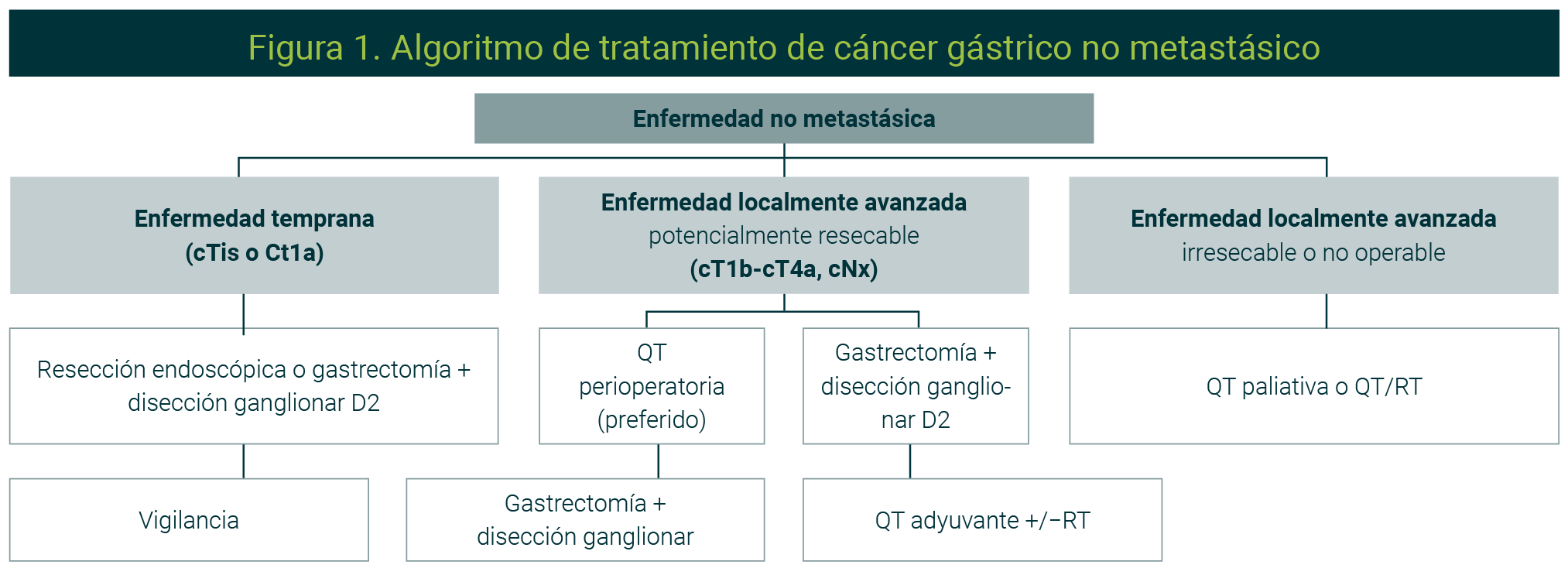 Actualmente, la quimioterapia preoperatoria es el tratamiento de elección para pacientes ≥ T1bN0M0, donde previamente se sugiere realizar una laparoscopia diagnóstica +/- lavado peritoneal. Los esquemas de quimioterapia perioperatoria de elección incluyen triplete con FLOT (8 ciclos) en pacientes con buen estado funcional o duplete con fluoropirimidinas + platinos (PF 6 ciclos o 5FU/AF/oxaliplatino, 8 ciclos).