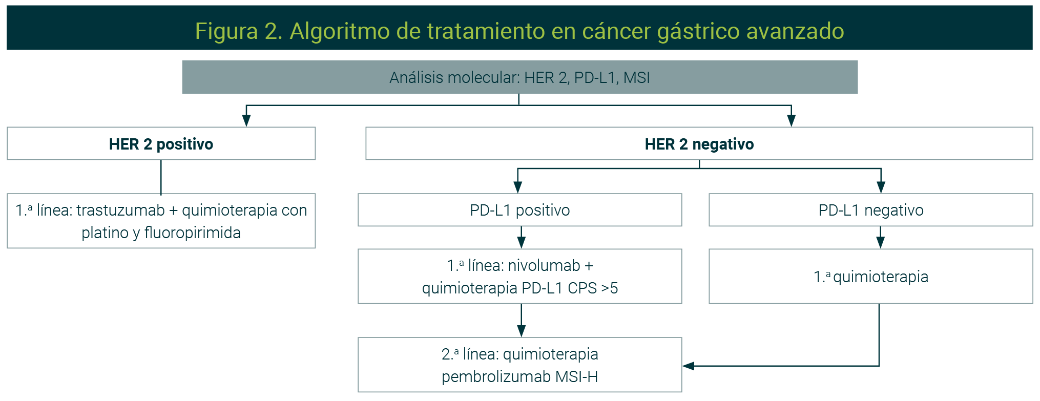 Las terapias dirigidas autorizadas para tratar el cáncer gástrico incluyen trastuzumab (primera línea para pacientes con HER2 positivo), taxanos con antiangiogénico de segunda línea y nivolumab recientemente autorizados en tumores con CPS > 5 o pembrolizumab (anti-PD-1 de tercera línea con MSI-H).