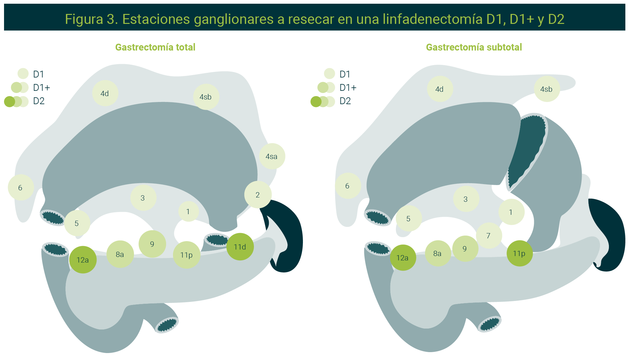 El tratamiento quirúrgico es la mejor opción para el control oncológico locorregional. La disección ganglionar D2 por estaciones ganglionares descrita desde 1961 por la escuela japonesa se considera piedra angular del tratamiento quirúrgico en Asia. En la Tabla 3 se muestran las estaciones ganglionares que ha descrito la escuela japonesa para el cáncer gástrico y en la Figura 2 se muestran las estaciones ganglionares que se deben disecar en una linfadenectomía D1, D1+ y D2, cuando realizamos una gastrectomía total y subtotal.17