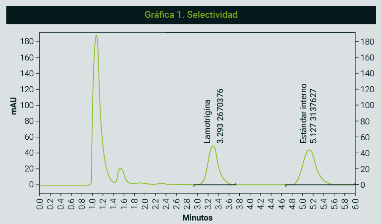 En esta expresión matemática (t) se refiere al tiempo de retención y (w) a la anchura del pico. En la gráfica 1 se observa el ejemplo de la corrida analítica de lamotrigina y su estándar interno, donde se demuestra que no existe sobreposición entre ellos. El resultado es una resolución mayor a 1.5 entre los picos.