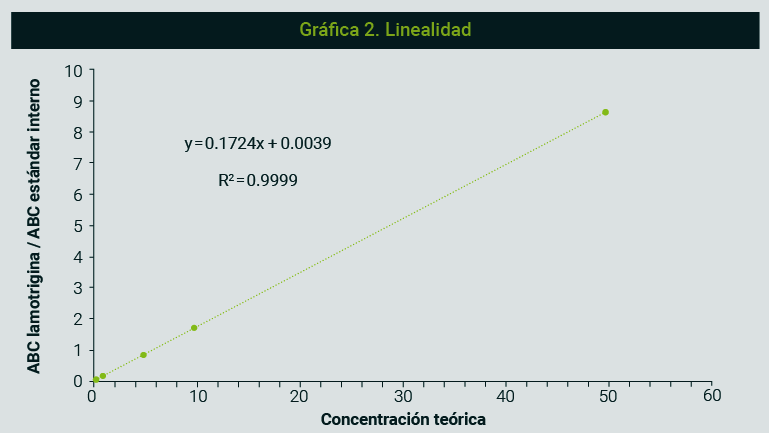 Para este ejemplo, las concentraciones de lamotrigina se eligieron conforme al intervalo terapéutico reportado entre 3 y 14 µg/mL del fármaco.13,14 En la gráfica 2 se observa que, para el ejemplo de la lamotrigina, existe una relación lineal continua y reproducible del tipo: y=mx+b, que se describe entre el rango de concentraciones establecido para el método (0.3 μg/mL, 0.5 μg/mL, 1 μg/mL, 5 μg/mL, 10 μg/mL y 50 μg/mL) y la señal cromatográfica (relación de áreas bajo la curva).