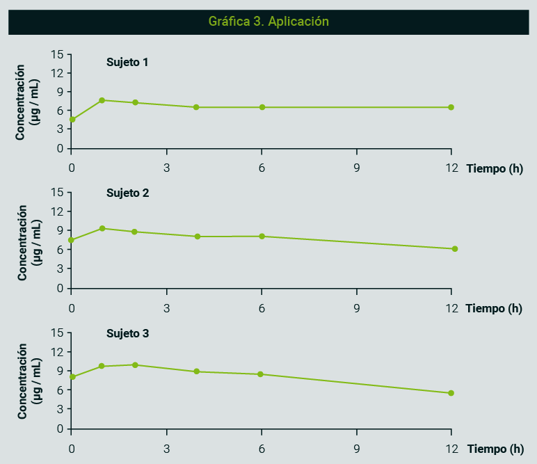 En la gráfica 3 se presentan cursos temporales de concentración plasmática de lamotrigina en función del tiempo que evidencia satisfactoriamente la aplicación de la metodología validada para cuantificar la sustancia de interés en plasma por medio de la técnica CLAR, acorde con los requisitos de la NOM-177-SSA1-2013 (modificación reciente).22 Los resultados sugieren que los niveles plasmáticos de lamotrigina en los pacientes se encuentran en el intervalo terapéutico señalado en la bibliografía.13,14