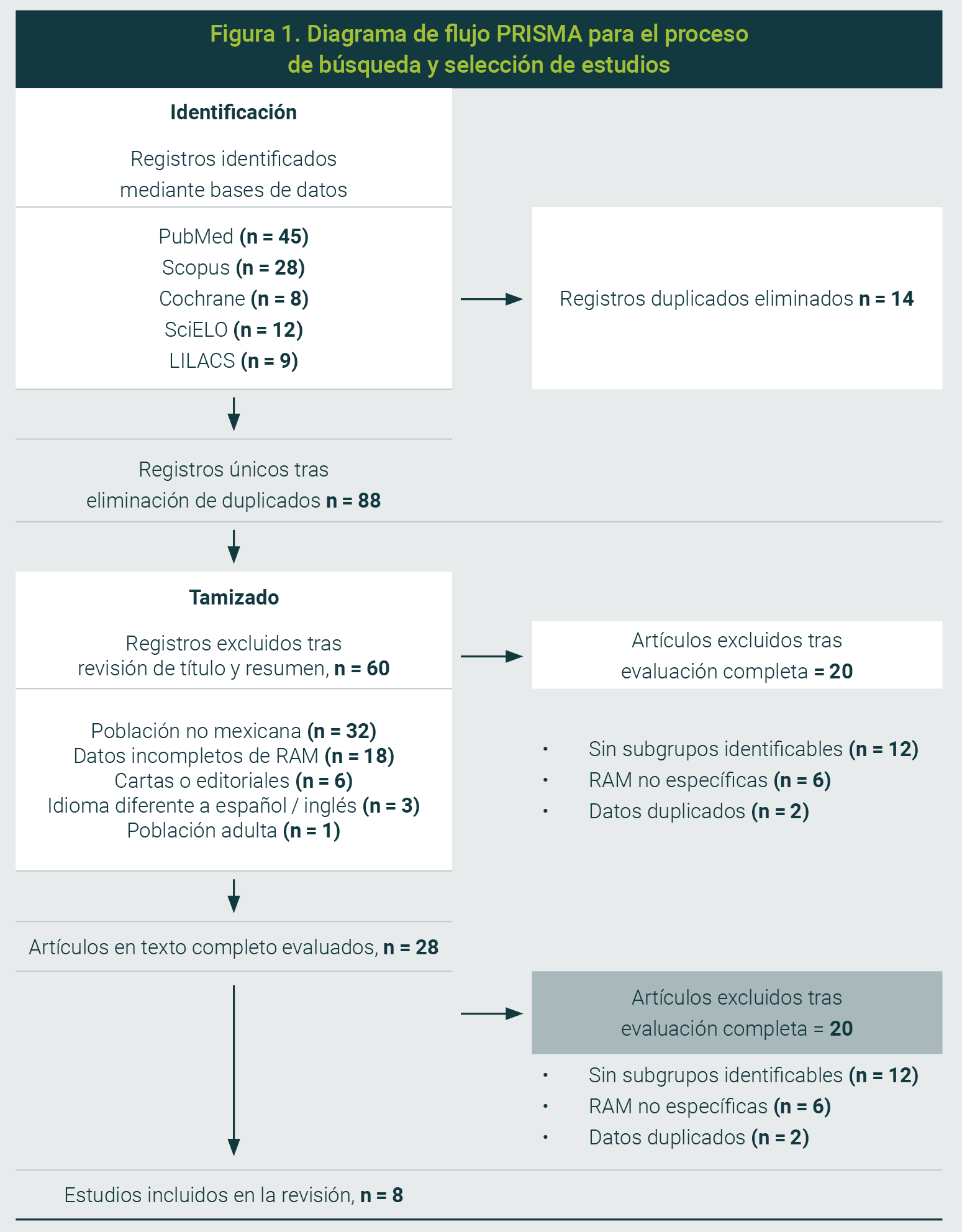 Tras la evaluación de los textos completos, se excluyeron 20 estudios adicionales porque no cumplían con criterios de población (por ejemplo, sin subgrupos identificables, n=12), no documentaban las RAM de forma específica o cuantificable (n=6), y contenían datos duplicados (reportes secundarios de los mismos pacientes (n=2). Finalmente, sólo ocho estudios cumplieron con los criterios de elegibilidad y fueron incluidos en la revisión sistemática.
