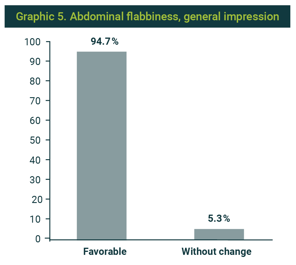 The favorable impression of the procedure's result was 91.3%; one case was reported without changes and another with unfavorable changes (Graphic 3). In 20 cases (86.9%), satisfaction with enzymatic management was reported (Graphic 4). Picture 2 shows the observed results with the application of two weekly sessions.