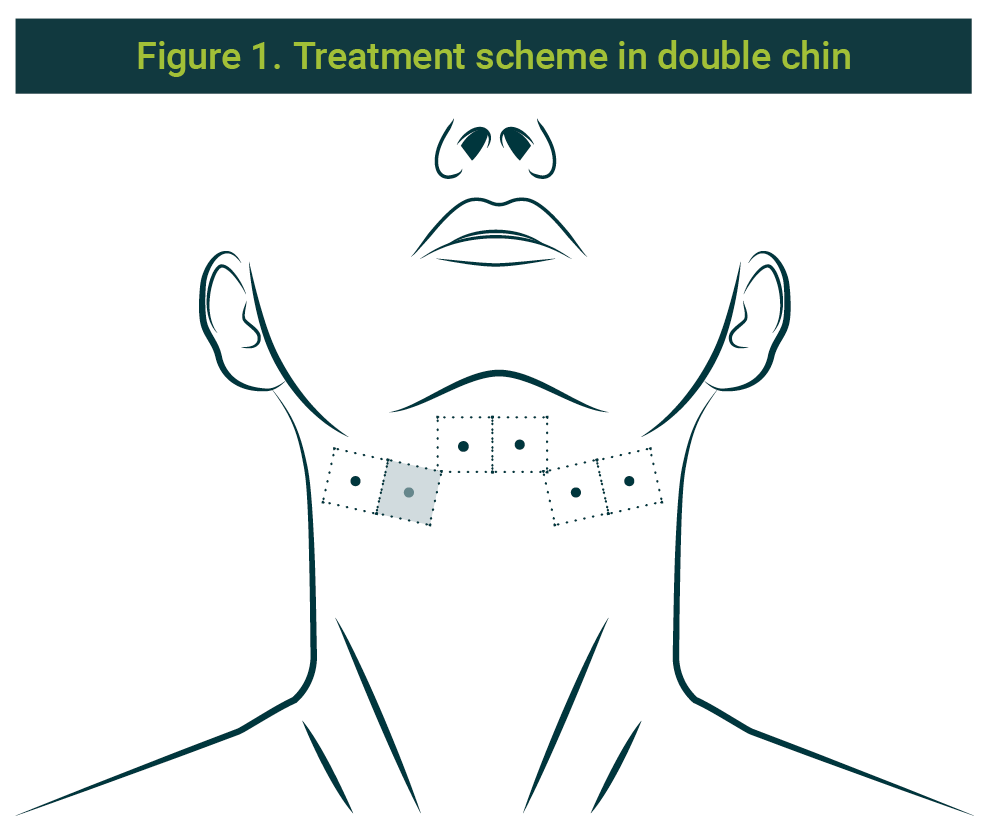 Previous informed consent obtained from the patient, and the diagnosis of volume and location of the preplastimal fat; asepsis and antisepsis of the area under the chin were made. 1 ml was applied, distributed on each point: 0.5ml on the profound level (subcutaneous) and 0.5ml on the superficial level (intradermic) of the combination of collagenase, hyaluronate lyase, and lipase, already prepared, on 6 points, separated 1 cm each; 2 left laterals, 2 centrals (parallels, behind the chin and before the hyoid) and 2 right laterals). The used needle size was 30G × ½ (13mm). Three sessions were performed, with a two-week or 15-day interval between them. The scheme can be seen in Figure 1.