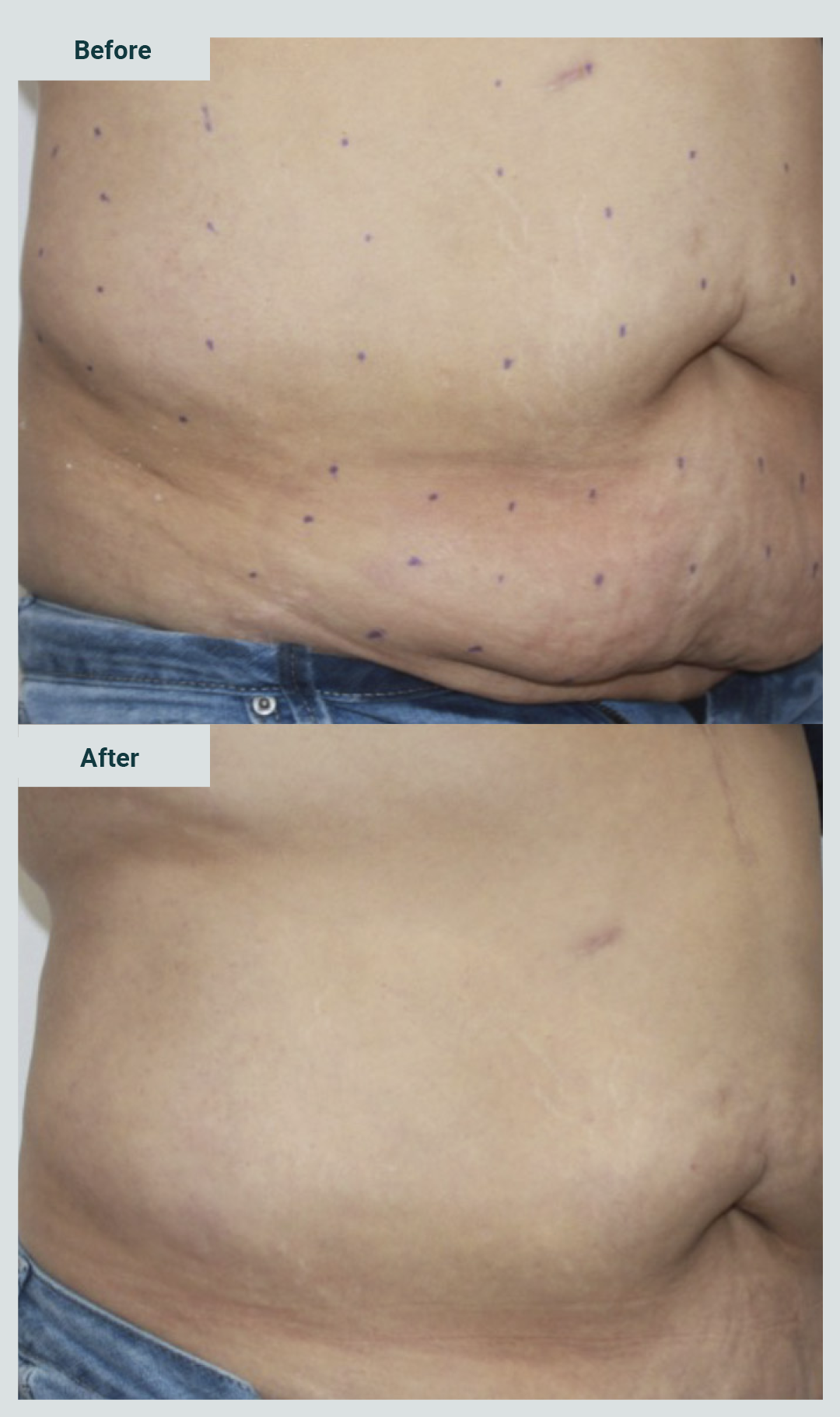 The combination of pbserum recombinant enzymes used was mostly collagenase, hyaluronate lyase, and lipase in 18 cases, and collagenase and lipase in one case. The most common volume used (73%) was 12ml; in 15 cases (78.9%), four sessions were required. In one case, 11 sessions were performed. The interval between sessions was weekly for 73.6% of the cases.