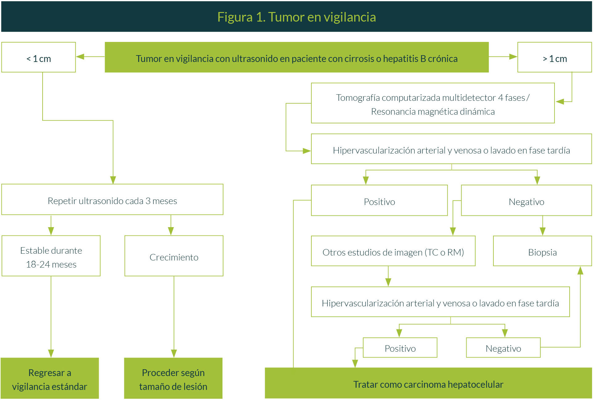 En nódulos < 1 cm, el diagnóstico diferencial entre nódulo de regeneración y CHC es extremadamente difícil. En caso de duda, se recomienda acortar el período de supervisión a un nuevo control a los tres meses de la detección. Si el nódulo incrementó en tamaño, se debe proseguir con otras imágenes. Si se mantuvo estable, se puede volver a la supervisión cada seis meses (Figura 1).