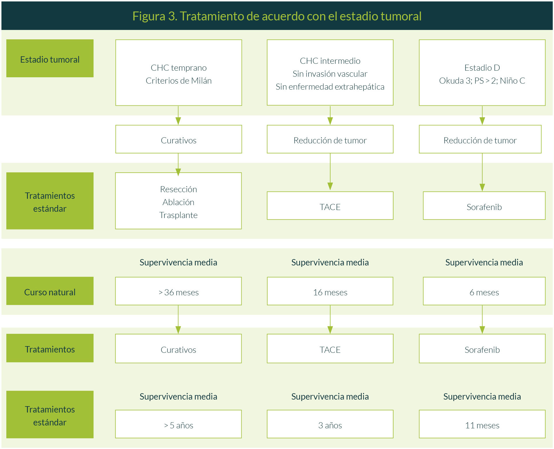 La figura 3 resume el tipo de tratamiento de acuerdo con el estadio tumoral.