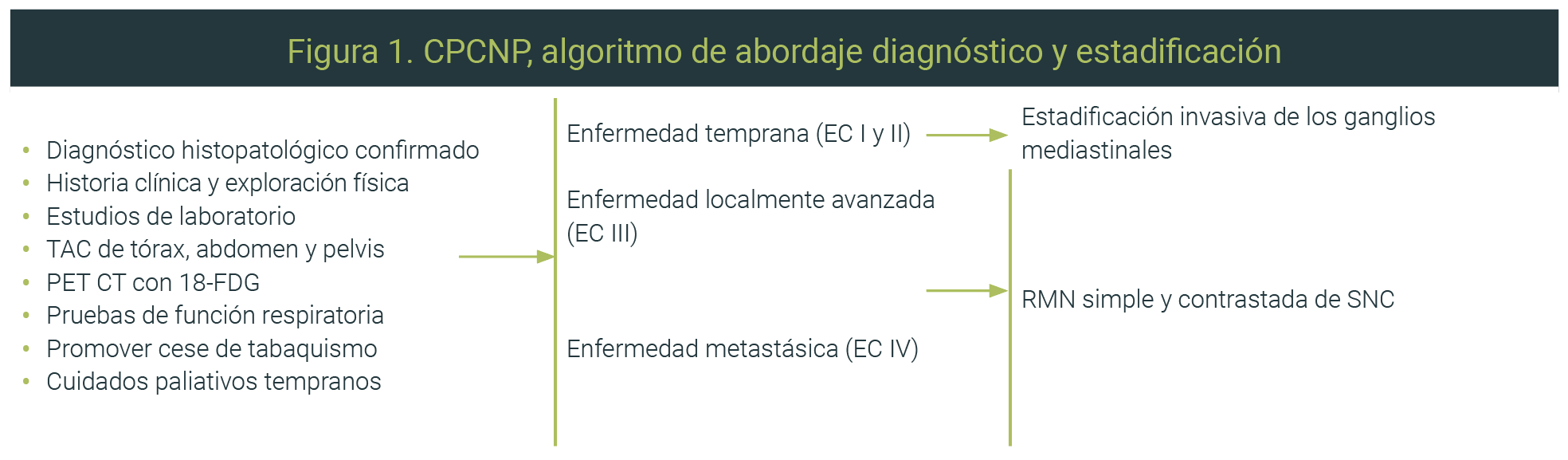 Para el diagnóstico patológico se recomienda seguir la clasificación de tumores pulmonares de la Organización Mundial de la Salud (OMS) 2015.7 Es recomendable obtener suficiente tejido para realizar el perfil básico de inmunohistoquímica y el perfil genómico, independientemente de la EC (Figura 1).