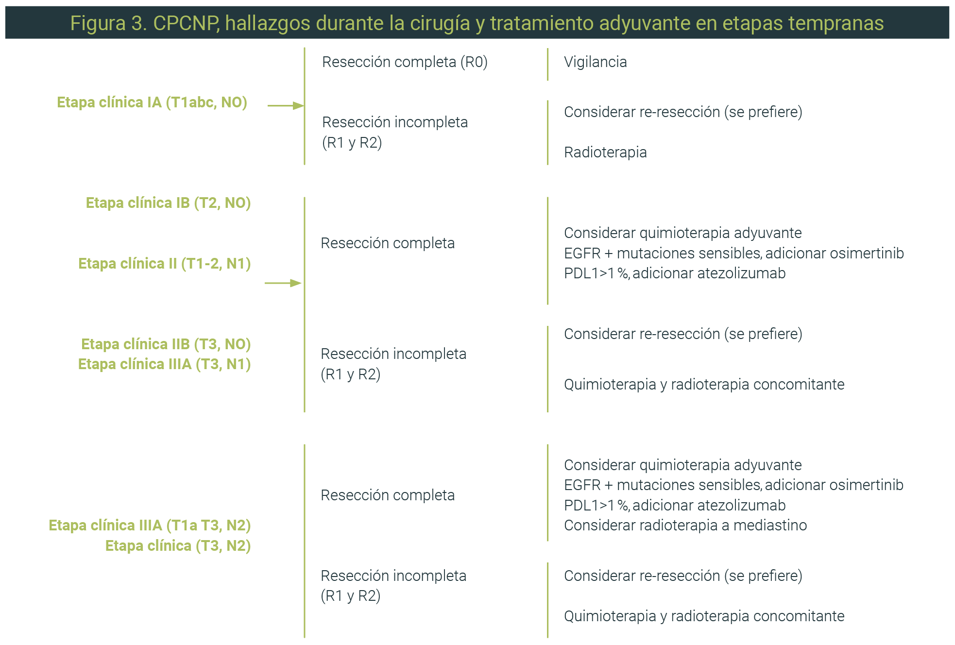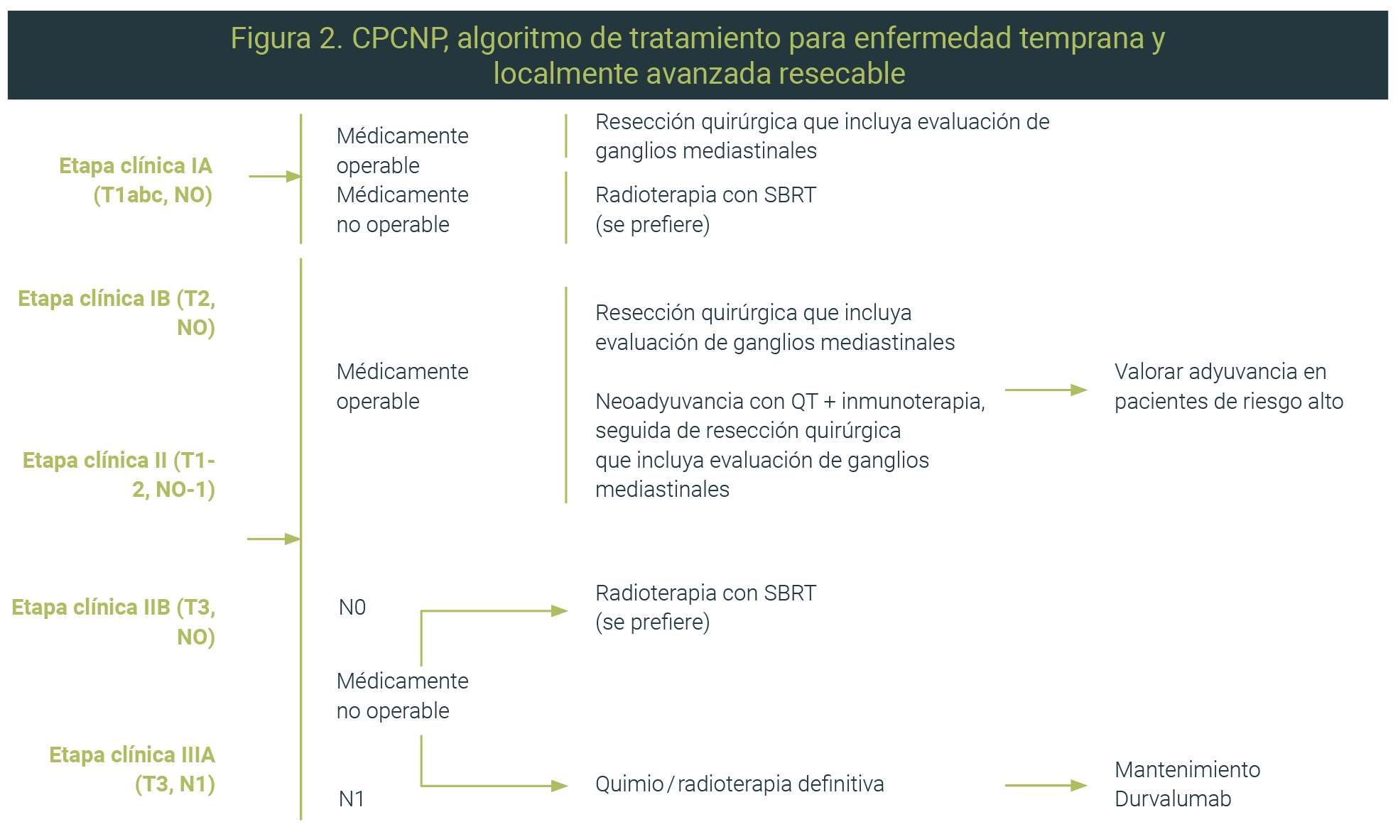 En la etapa clínica temprana, la resección quirúrgica y la radioterapia estereotáxica son opciones terapéuticas importantes, mientras que en la enfermedad localmente avanzada irresecable, la quimiorradioterapia es el tratamiento estándar; la inmunoterapia es el tratamiento de mantenimiento de elección en pacientes con respuesta parcial o enfermedad estable.