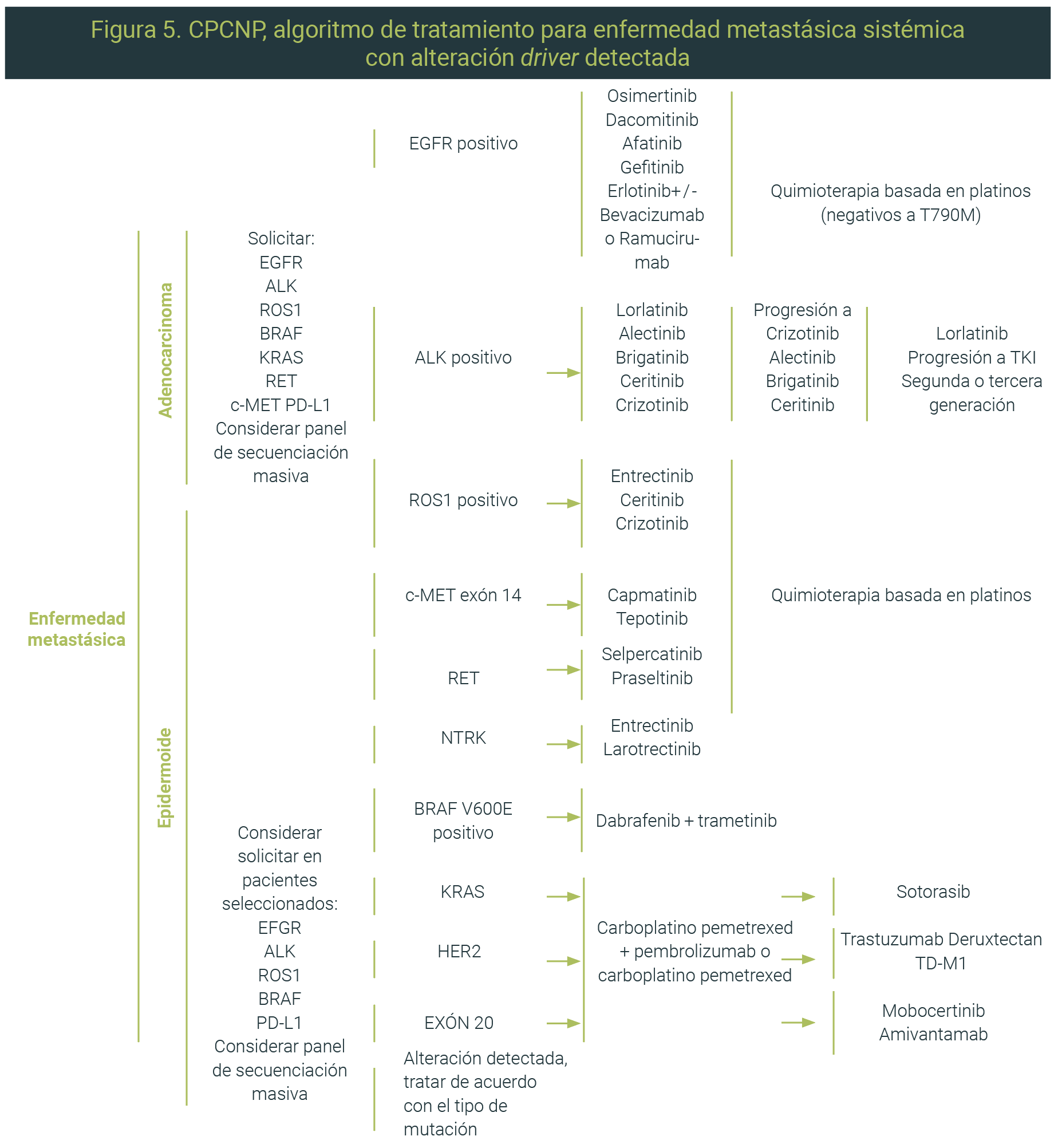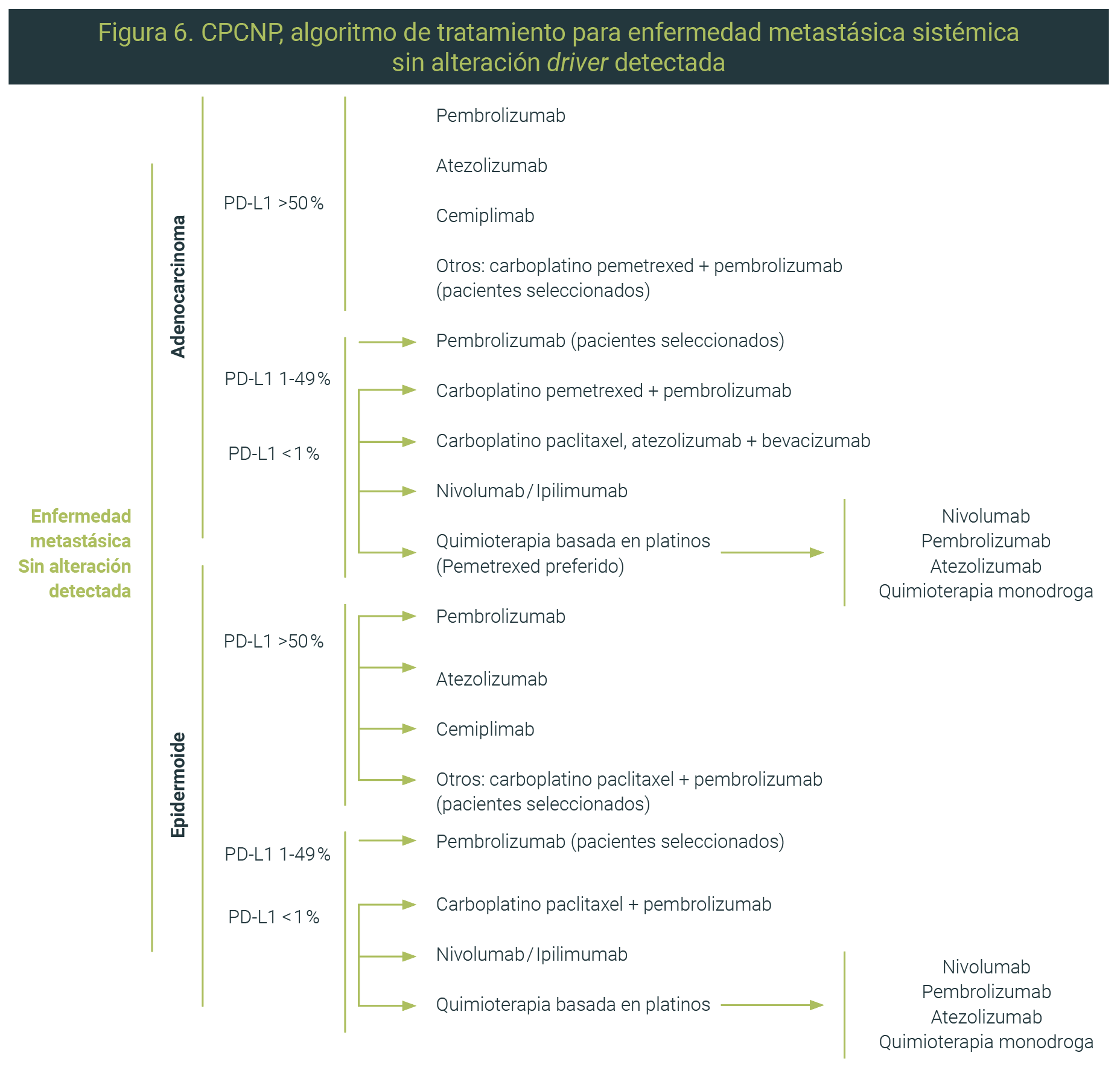 En la enfermedad metastásica, se recomienda la evaluación molecular para determinar mutaciones driver y PD-L1, y la quimioterapia basada en platino es el tratamiento de primera línea en pacientes sin mutaciones driver.